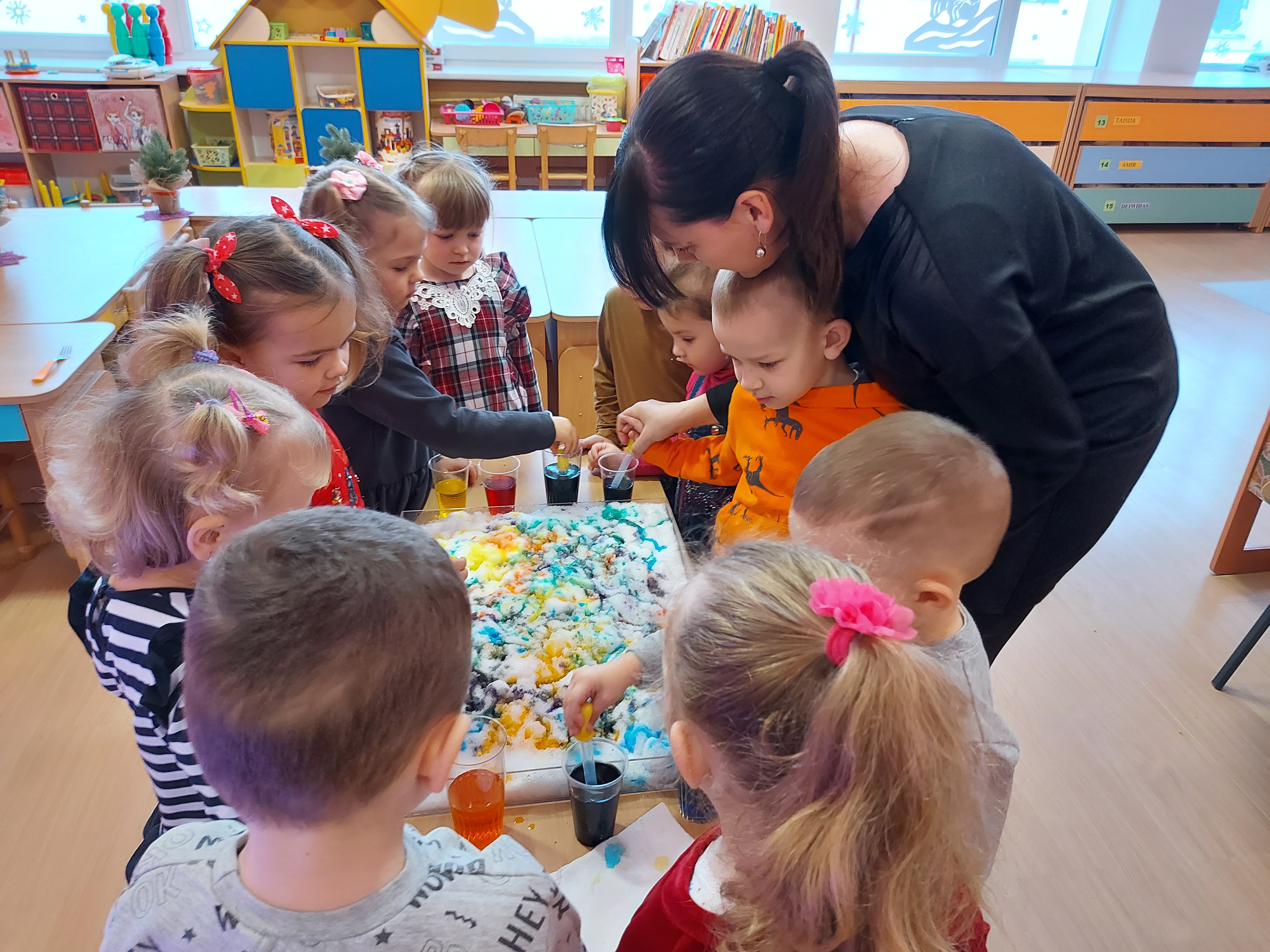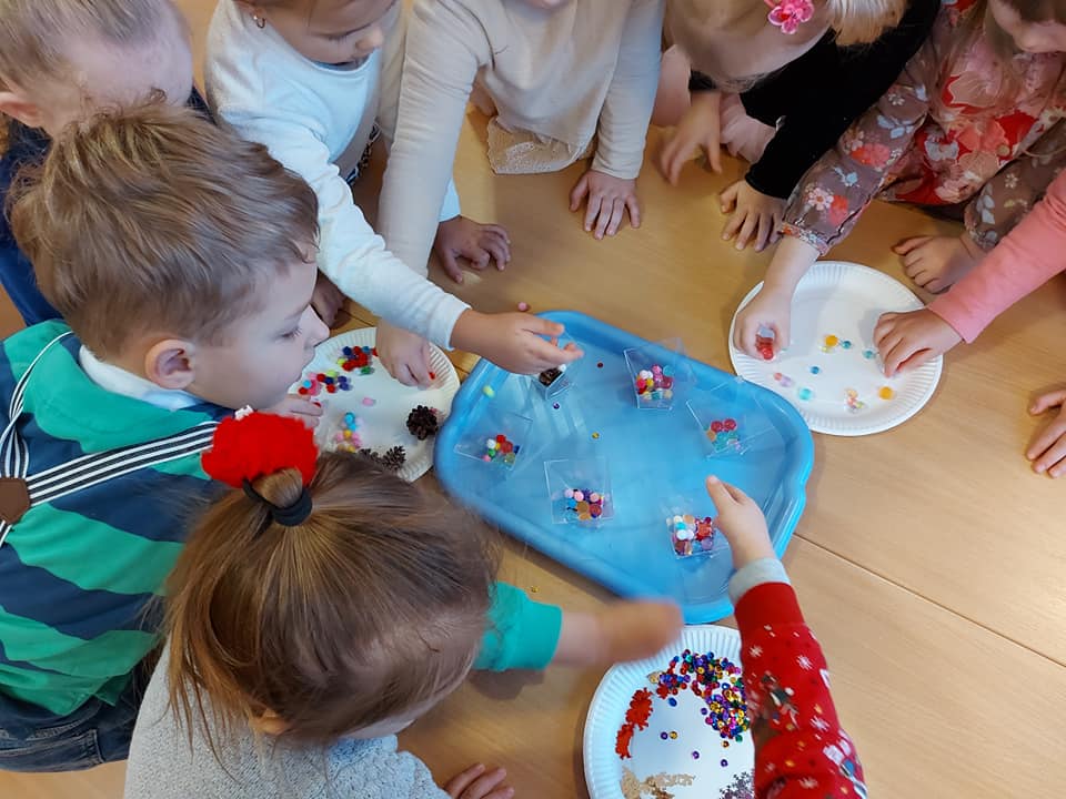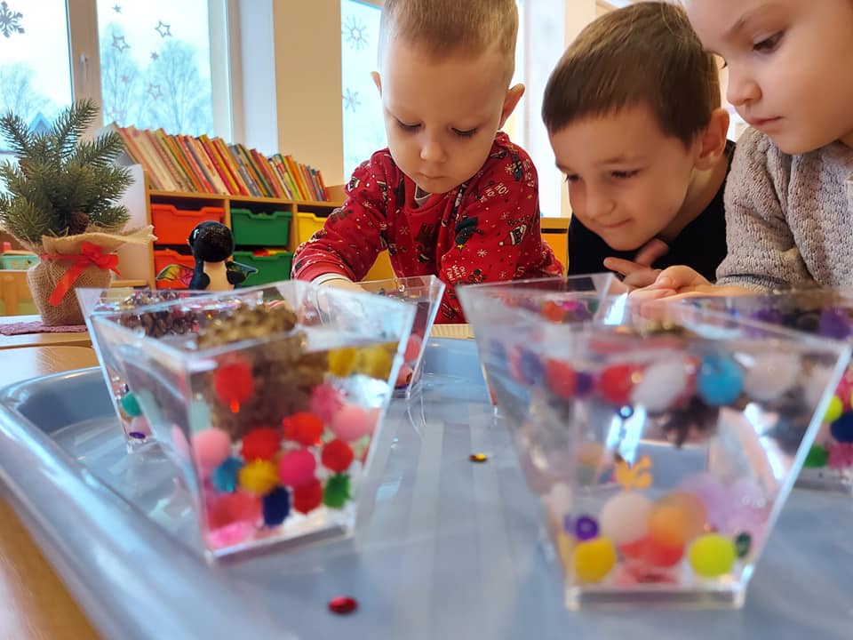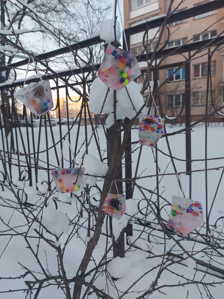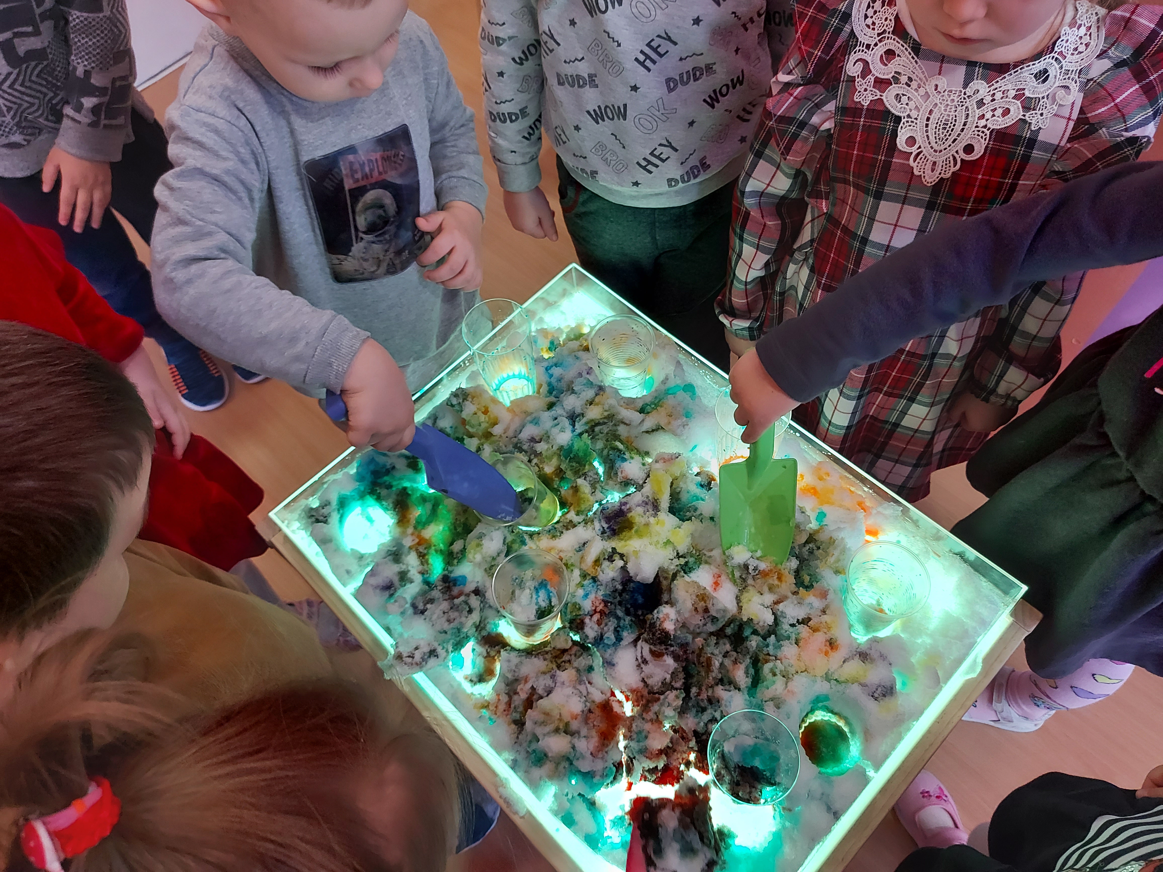 Wreszczie nadeszła zimowa aura, sypnęła puszystym śniegiem, panuje prawdziwa zima, więc czas się wziąść za czarowanie i eksperymentowanie tej piękności. Dzieci z grupy Biedronki postanowiły zrobić eksperymenty ze śniegiem, wodą oraz koloromi i to wszystko połączyć w jedno – zimę. Podczas tygodniowych zajęć malowaliśmy śnieg różnymi kolorami, z którego póżniej tworzyliśmy kolorowe babki i ustawialiśmy je na śniegu. Na placówce przedszkolnej zauważyliśmy smutne malutkie drzewko, które pocieszyliśmy pięknymi dekoracjami. Biedroneczki zrobiły je bardzo łatwym sposobem, co widzimy na zdęciach. Na koniec pozwoliliśmy naszym rączkom porelaksować, bawiąc się z wodnymi piłeczkami, które także wyczarowaliśmy.