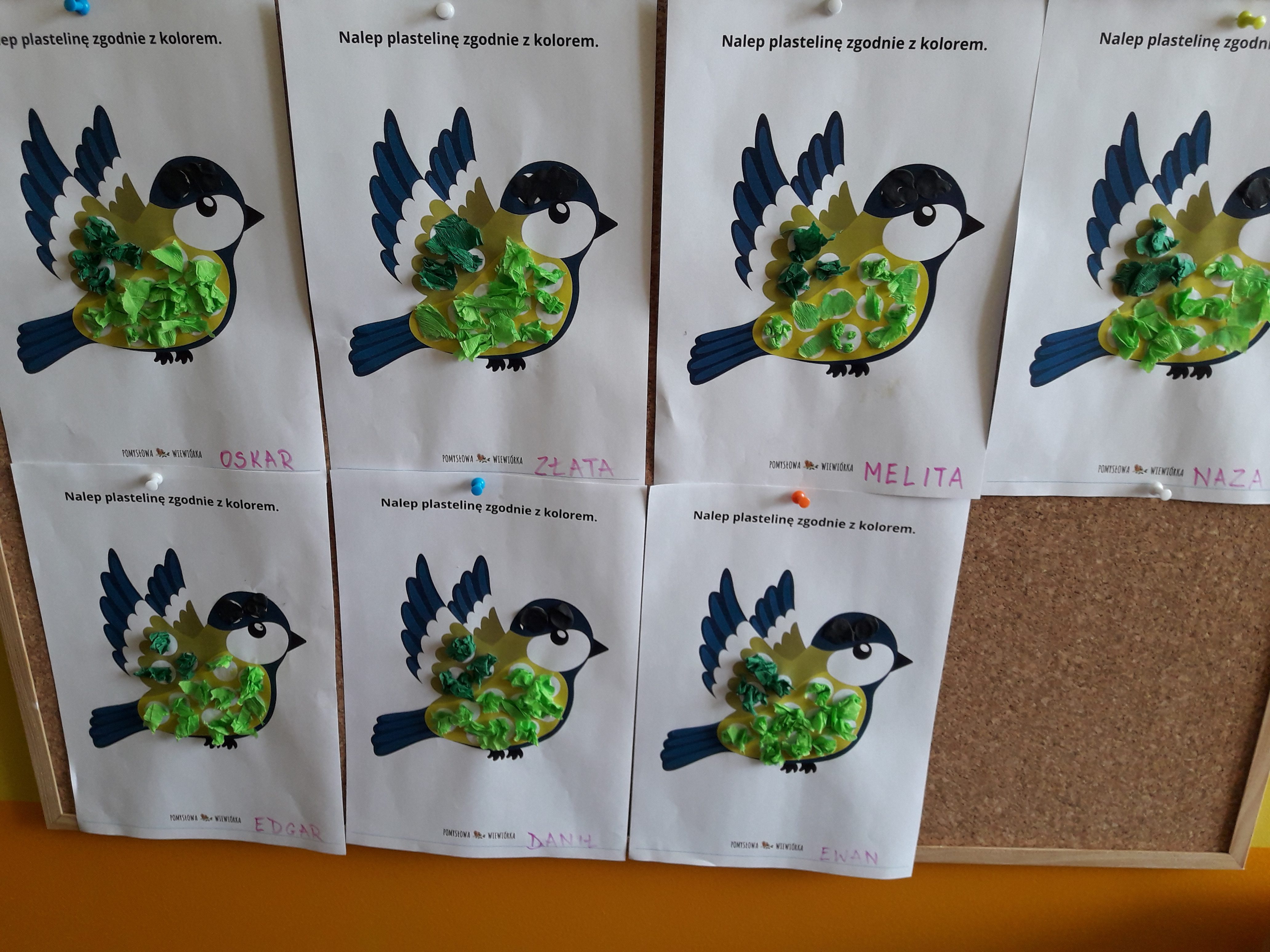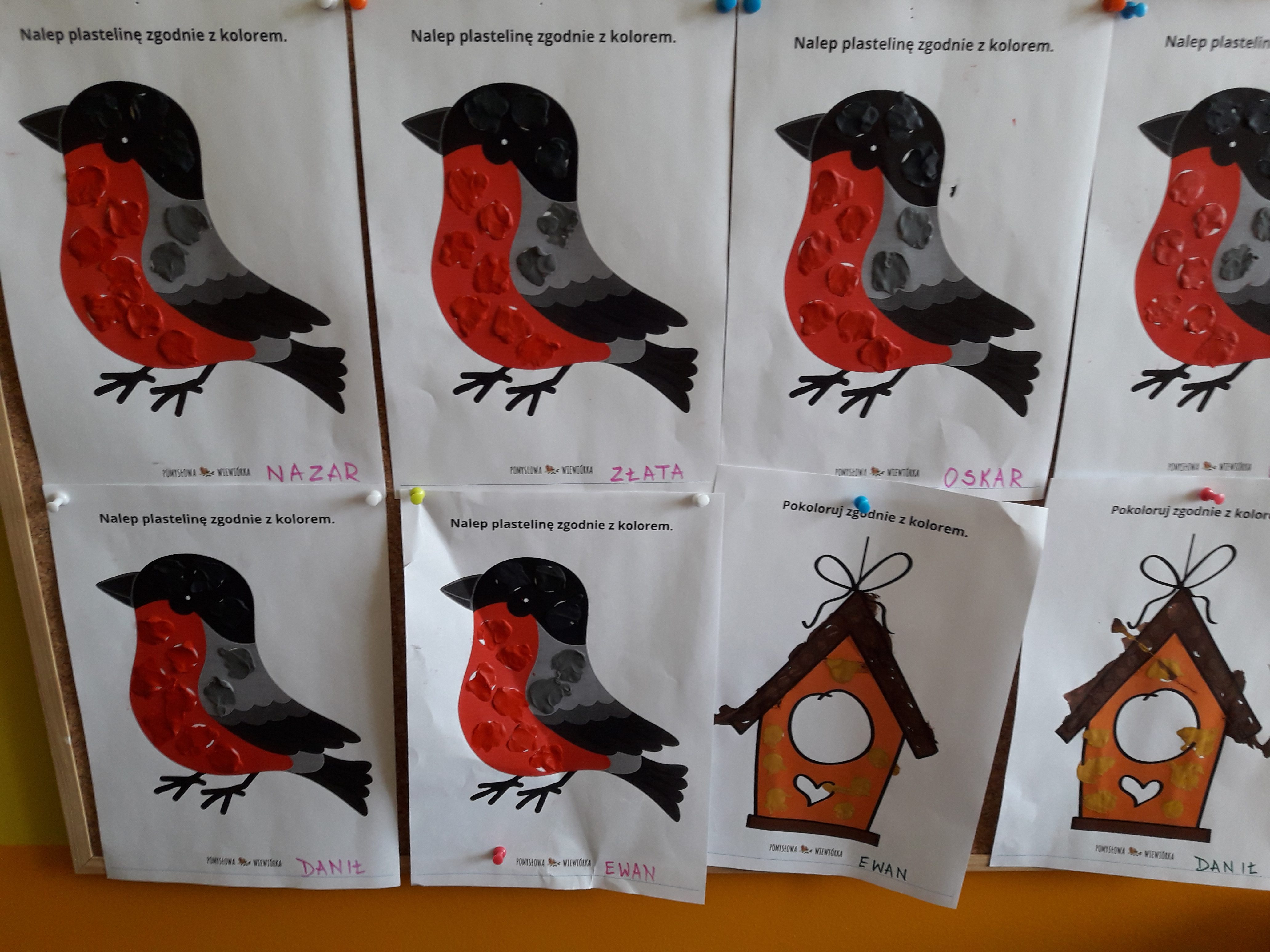 Cieszyła się powodzeniem u dzieci zabawa orientacyjno–porządkowa „Ptaszki do karmnika”. Dzieci pod muzykę poruszają się, naśladując latające ptaki. Podczas przerwy w muzyce przykucają, stukają palcuszkiem o podłogę, udając dziobanie ziarenek. Później wykonaliśmy pracę plastyczną z plasteliny lub krepiny, dobierając odpowiednie kolory. Tak powstała u nas cudowna galeria ptaków.