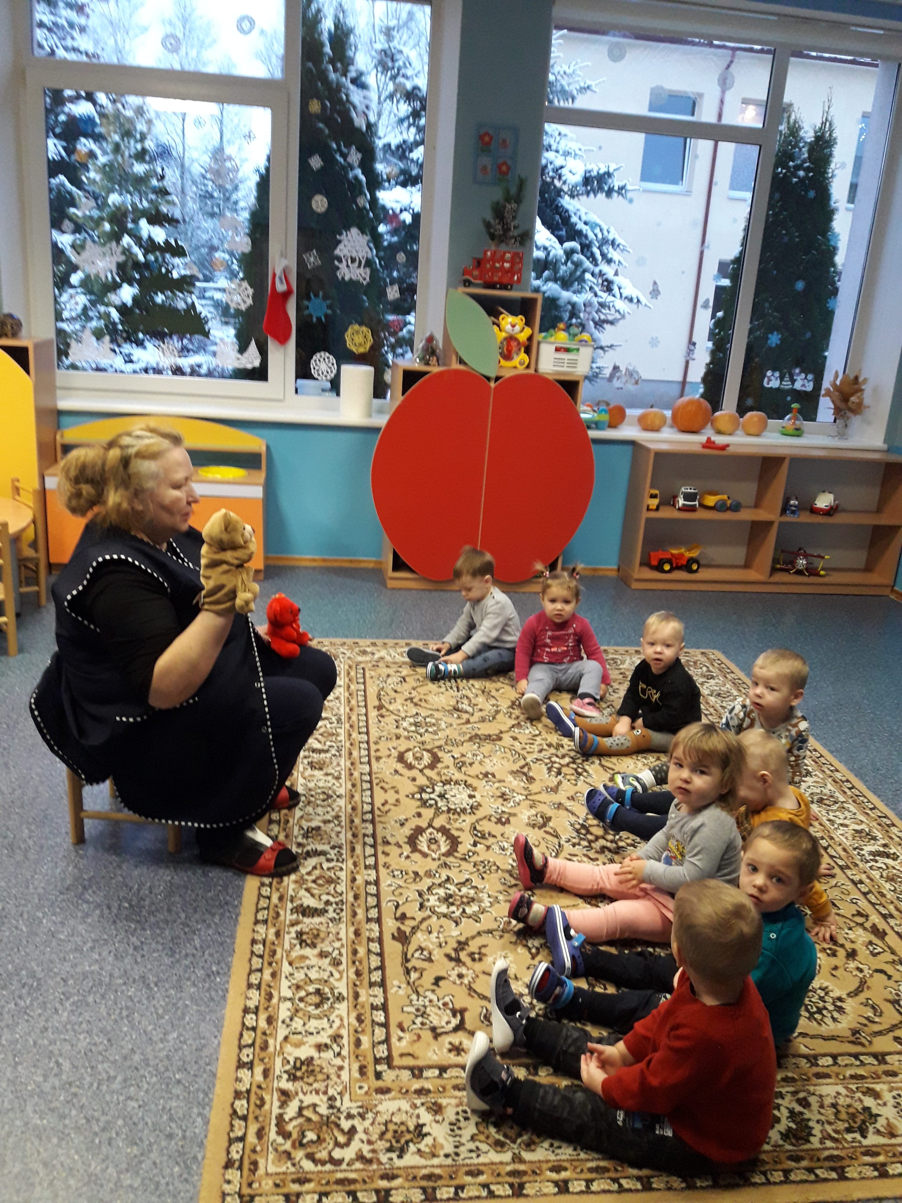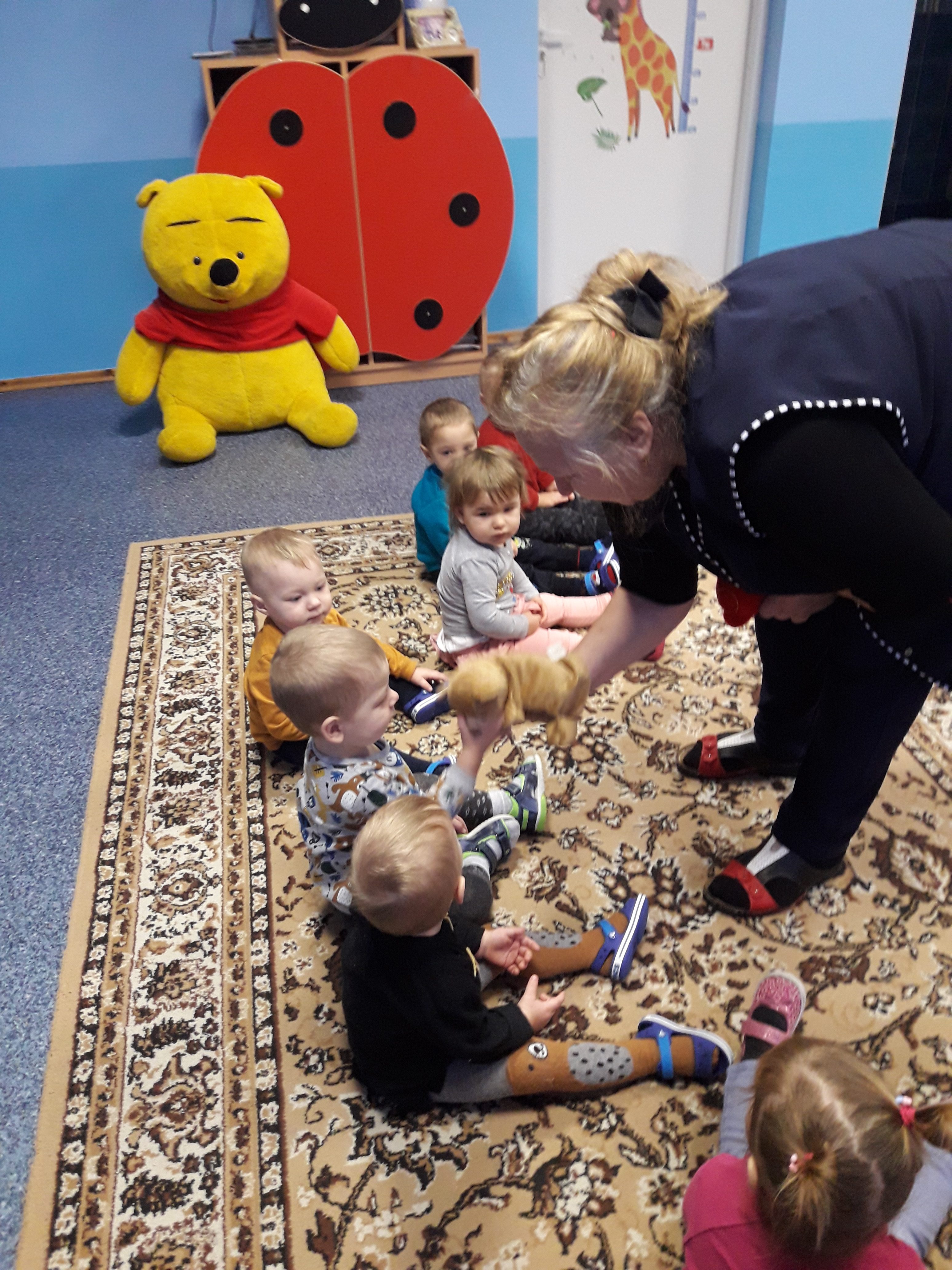 Ponieważ jesteśmy maluchami, to misiowy temat trwał dłużej niż zazwyczaj. Włączyłam do planu więcej zabaw ruchowo – naśladowczych, na przykład: zabawa bieżna „Słonko budzi misia”. Słonko, chodzi między misiami. Kogo dotknie, ten się budzi. Kiedy obudzi wszystkie misie to wstają i biegają. Podobała się dzieciom zabawa rytmiczna „Idzie niedźwiedź”. Dzieci słyszą: „Idzie niedźwiedź, człap, człap, człap”, a przy wyrazach dźwiękonaśladowczych rytmicznie klaszczą, tupią, uderzają dłońmi o uda. Bawiliśmy się również naśladując ruchem treści wiersza J.Wasilewskiej „A ten miś…”.
