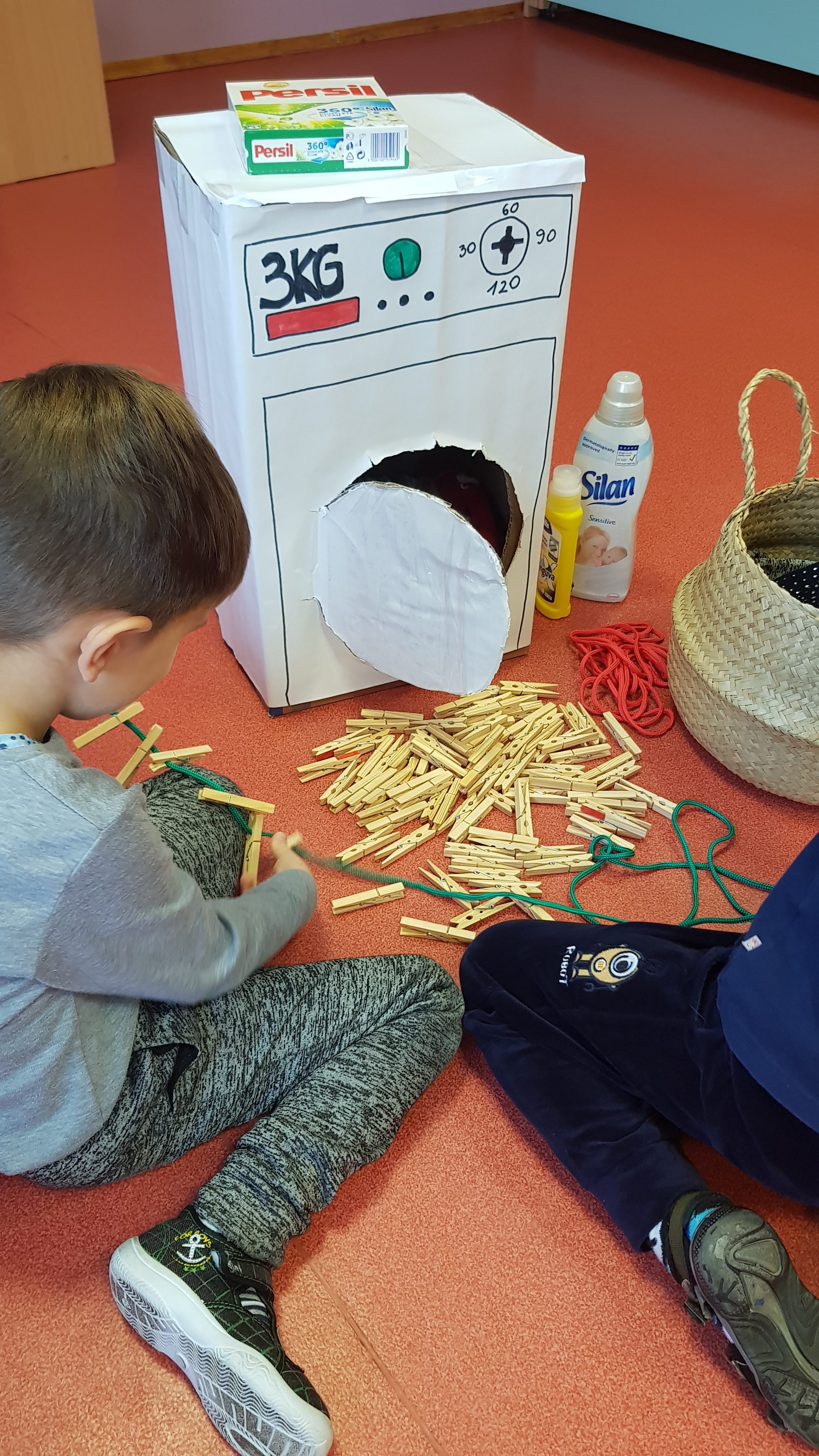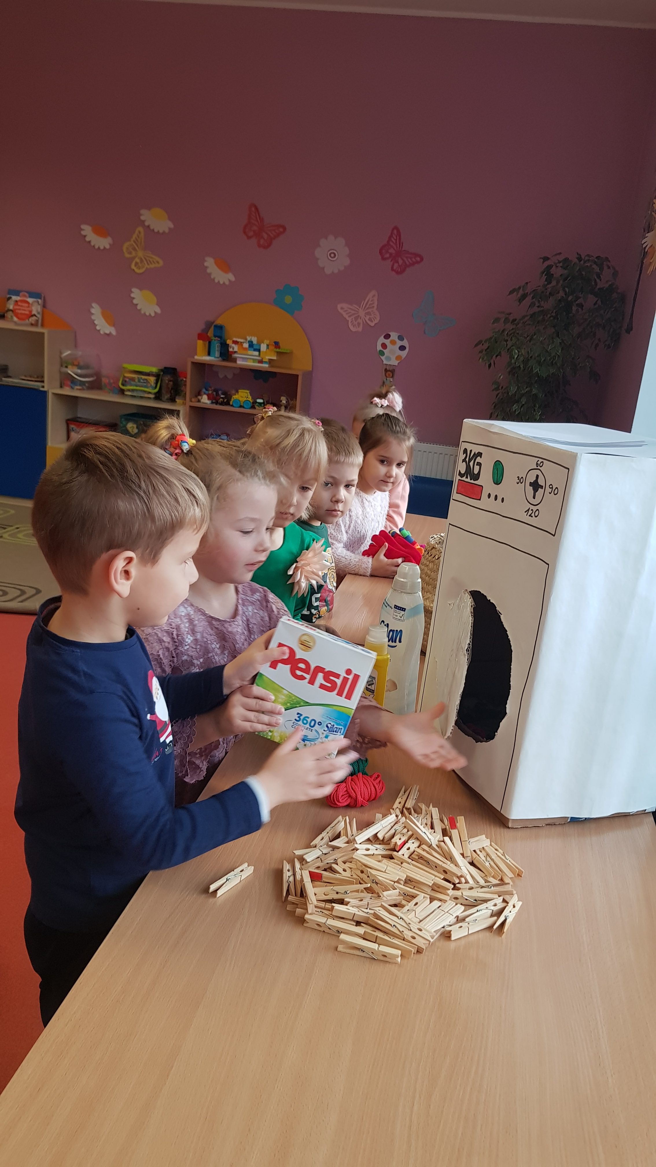 Dzieci zapoznały się z rodzajami ciuchów, segregowały ubranie ze względu, do której części ciała ubranie jest przeznaczone, zapoznały się z etapami prania, rozwieszały wyprane ubrania, korzystając z klamerek, tworzyły własną pralkę i zrobiły wielkie pranie. Zostało ono bardzo starannie rozwieszone i wysuszone. Dzieci wykonały kreatywną pracę plastyczną “Kalosze i kałuża”, którą rodzice mogą zobaczyć u nas w grupie na wystawie. A na koniec mieliśmy zorganizowany pokaz mody przez dzieci. “Myszki” potrafią odważnie i wesoło zaprezentować przygotowane stroje oraz umieją starannie działać.